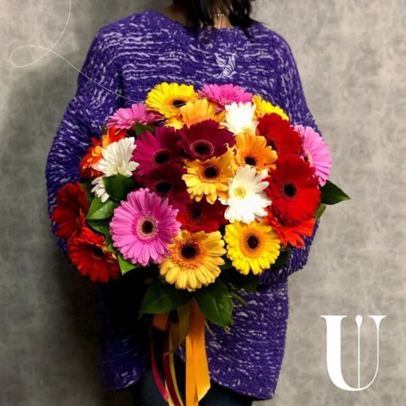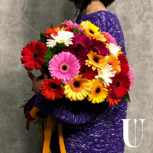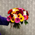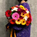 Авторский букет из розовых гербер, роз Талея, лиловых диантусов и белых лизиантусов в дизайнерской пленке