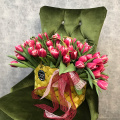 Авторский букет из фиолетовых калл, малиновых диантусов и фиолетовых сантини в дизайнерской упаковке