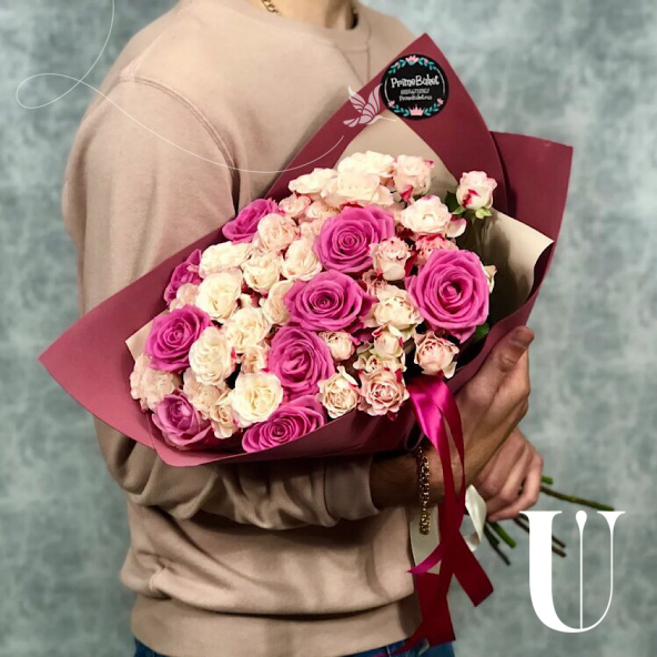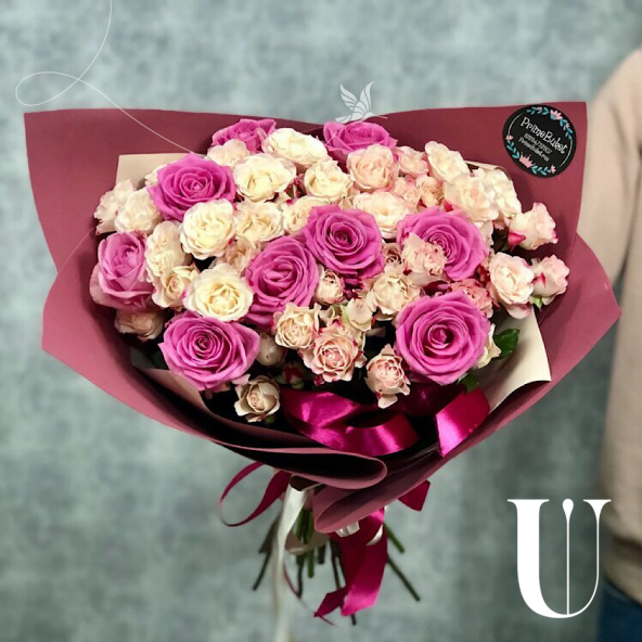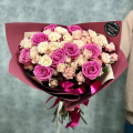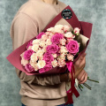 Авторский букет из роз Эрмоса, белых маттиол и диантусов Пинк в дизайнерской упаковке