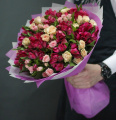 Классический букет из роз, кустовых хризантем и эустомы в упаковке