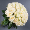 Составной букет из роз Вайт Охара, кремовых диантусов и белых маттиол в дизайнерской упаковке