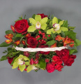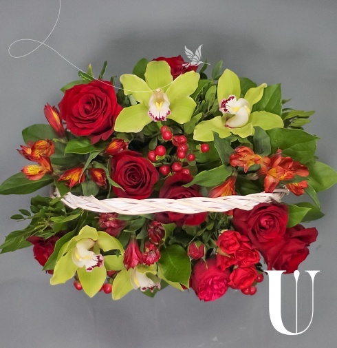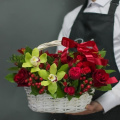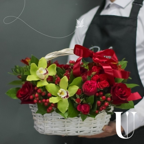 Роза пионовидная красная ред пиано 1шт, роза красная кустовая 1шт, роза красная кения 40 см - 7шт, орхидея цимбидиум зеленая 4шт, гиперикум красный 3шт, альстромерия красная 3шт, писташ, салал