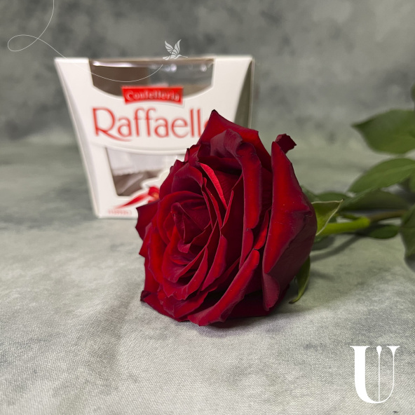 Коробка конфет Раффаелло классическая 150г с красной розой.