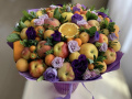Авторский букет из розовых гербер, роз Талея, лиловых диантусов и белых лизиантусов в дизайнерской пленке