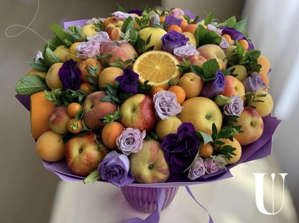 Сборный букет из розовых роз, розовых диантусов, голубой гортензии и белых эустом в дизайнерской упаковке