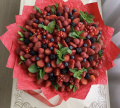 Композиция из роз сорта Талея, диантуса, альстромерий и других цветов в дизайнерской упаковке