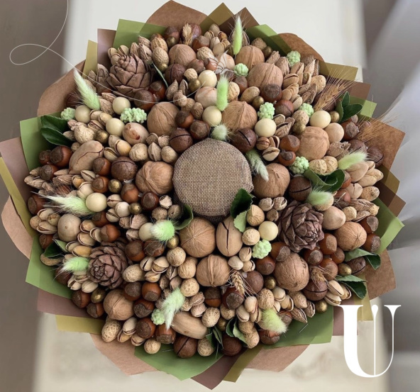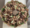 Букет из коричневых хризантем, кустовых пионовидных роз Джульетта и белой альстромерии в бордовой пленке
