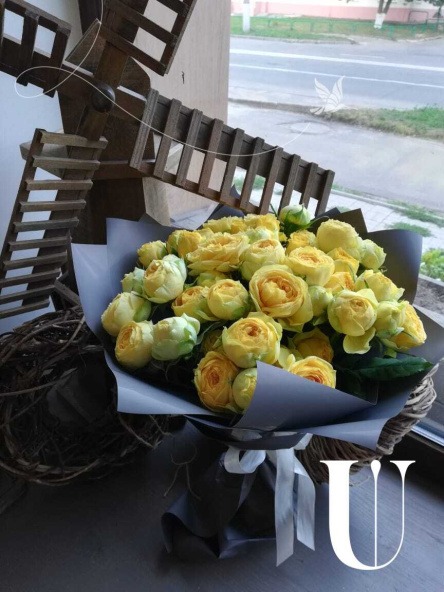 Кремовый монобукет из 19 роз сорта Талея в дизайнерской упаковке