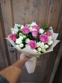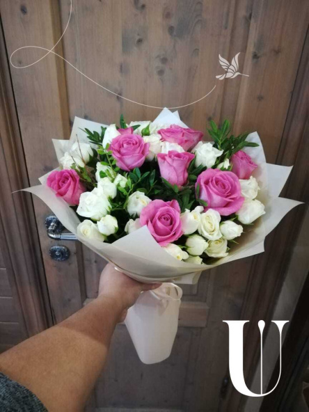 Букет из 11 розовых кустовых роз в дизайнерской бумаге