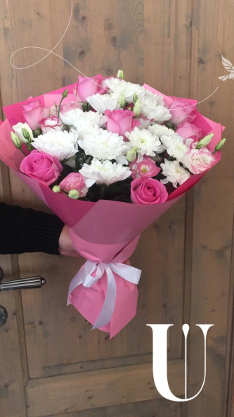Букет из роз Пинк Мондиаль, лиантуса Пинк и белой кустовой хризантемы в упаковке