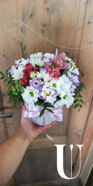 альстромерия,орхидея,эустома,хризантема,фисташка,коробка,лента