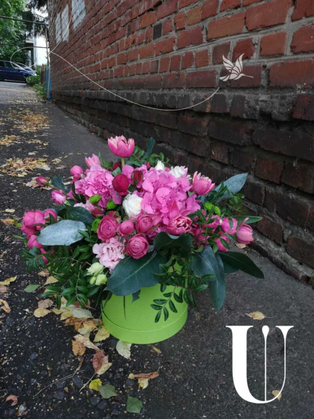 гортензия,пион,эвкалипт,фисташка,роза пионовидная,эустома,шляпная коробка