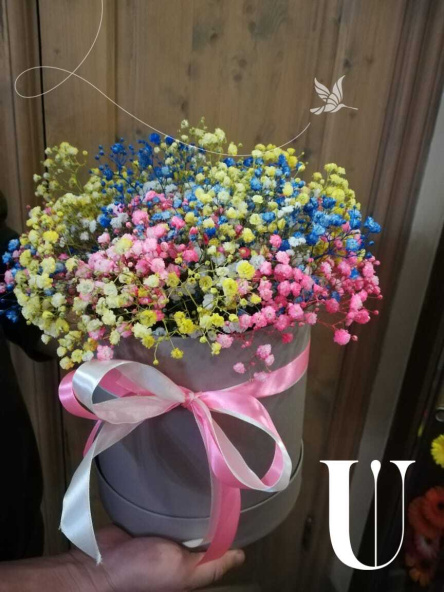 Мини-композиция из розовой гортензии в дизайнерской бумаге