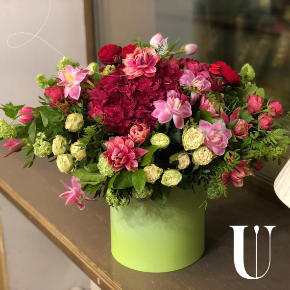 гортензия,роза пионовидная ,орхидея,фисташка,шляпная коробка
