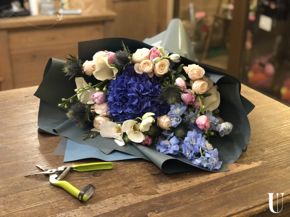 Гортензия,орхидея,роза пионовидна ,эрингиум,калла,тюльпан,фрезия
