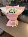 Авторский букет из пионовидных роз Шиммер, нежно-розовых диантусов и белой кустовой хризантемы в упаковке