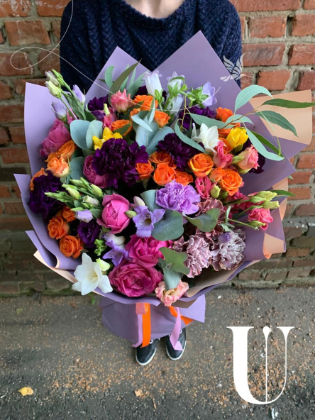 Пион,гвоздика,фрезия,роза кустовая,эустома,эвкалипт,аденофора