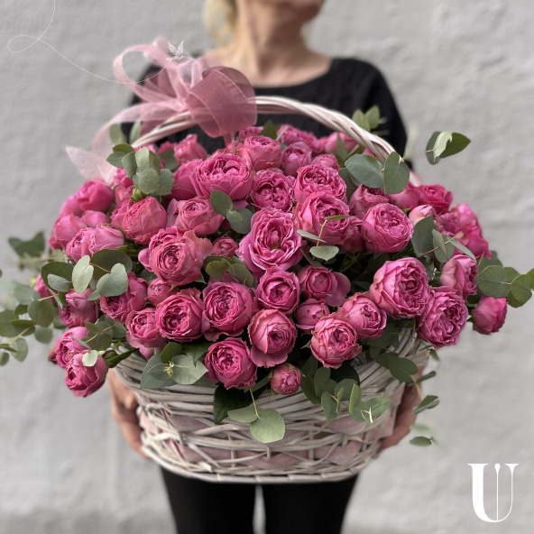 Пионовидная Роза Мисти баблс 29 шт., эвкалипт 3 шт., корзина средняя, губка 2 шт., лента.