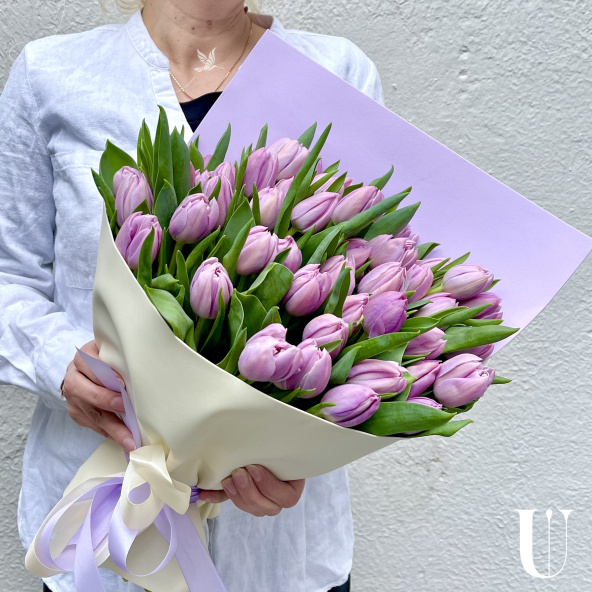 Стильный букет из персиковых роз Кахала и лавандовых маттиол в дизайнерской упаковке