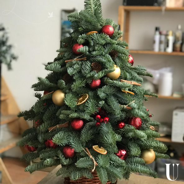 Ель ручной работы сорта нобилис. Собрана на флористической губке пиафлор, простоит 2.5месяца. Украшена игрушками(мы повторяем цвет, но игрушки могут быть разнообразными)