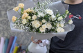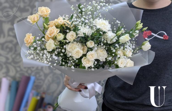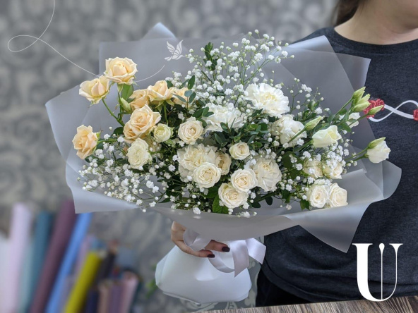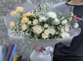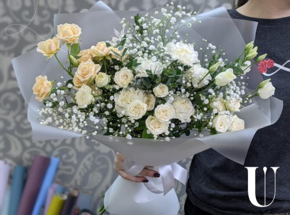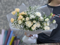 Авторский букет из роз Эрмоса, белых маттиол и диантусов Пинк в дизайнерской упаковке