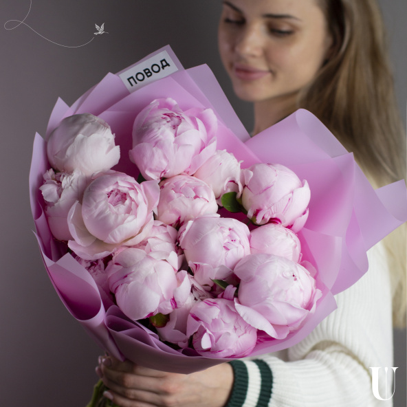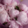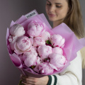 Классический букет из розовых пионов и кремовых кустовых роз в розовой упаковке