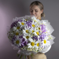 Авторский букет из роз Пину Охара, розовых диантусов и лавандовых маттиогл в упаковке