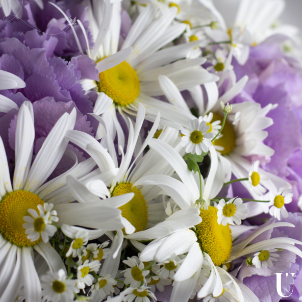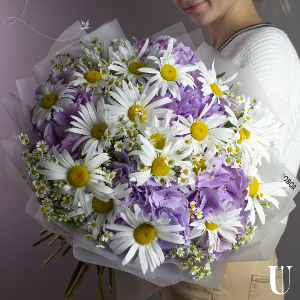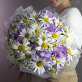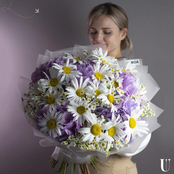 Авторский букет из зеленых вибурнов, фиолетовой гортензии и лавандовых эустом в упаковке