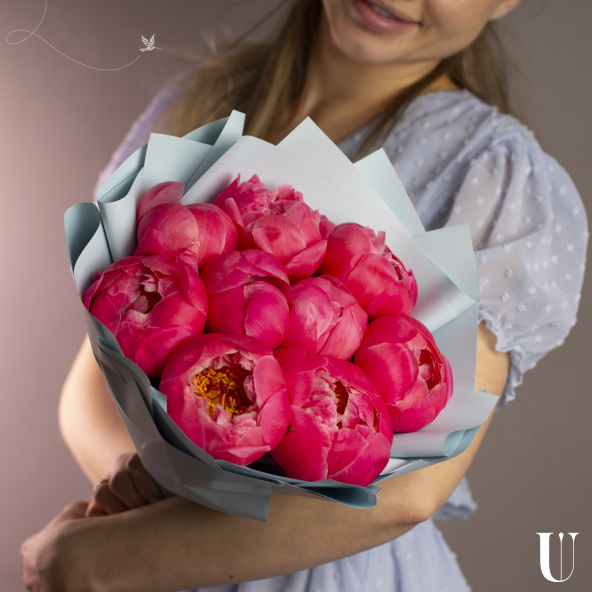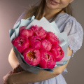 Авторский букет из розовых пионов, белых кустовых роз и белых диантусов в пленке
