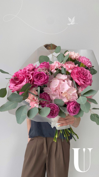 Авторский букет из розовых гортензий, роз Пинк Мондиаль и розовых диантусов в белой упаковке