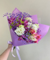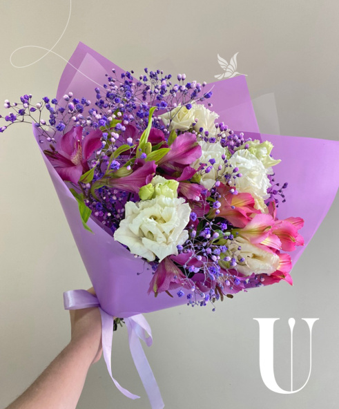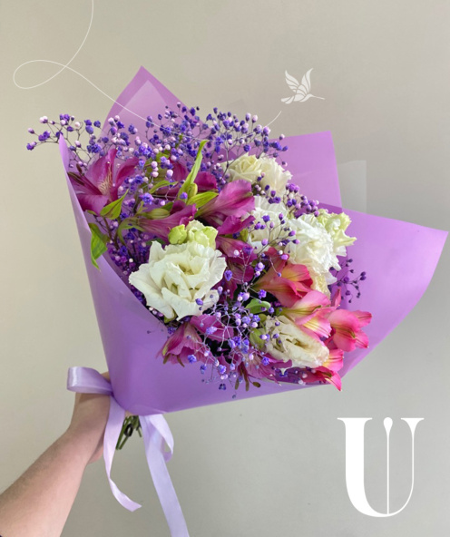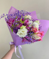 Букет из розовых эустом, диантуса Гипносис и розовой альстромерии в упаковке