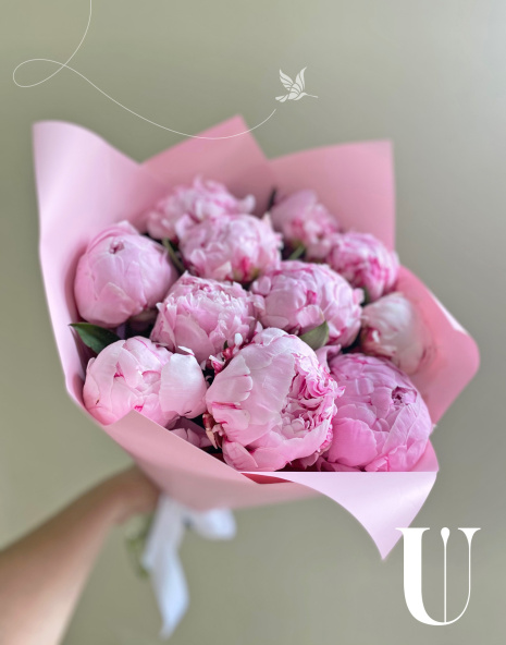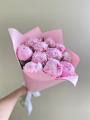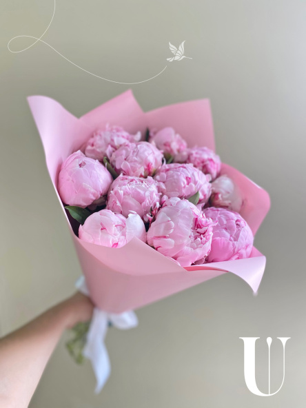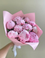 Авторский букет из пионов сорта Сара Бернар, розы Маритим, маттиолы и кустовой пионовидной розы в дизайнерской упаковке