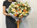 Авторский букет из розовых кустовых роз, белых роз, хризантем и розовых альстромерий