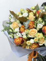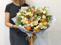 Сборный букет из кремовых диантусов, роз Мисс Бомбастик и белых эустом в упаковке