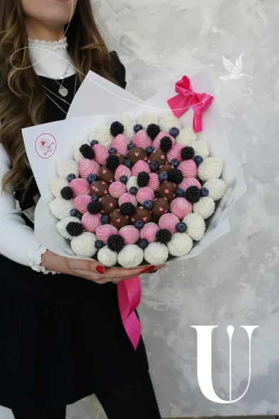 - Букет из клубники в настоящем бельгийском шоколаде BarryCallebaut c добавлением голубики и ежевики. В данном размере букета -до 55 ягод отборной и крупной клубники. Средний вес букета - 3.3 кг! Такого количества хватит как на целую семью