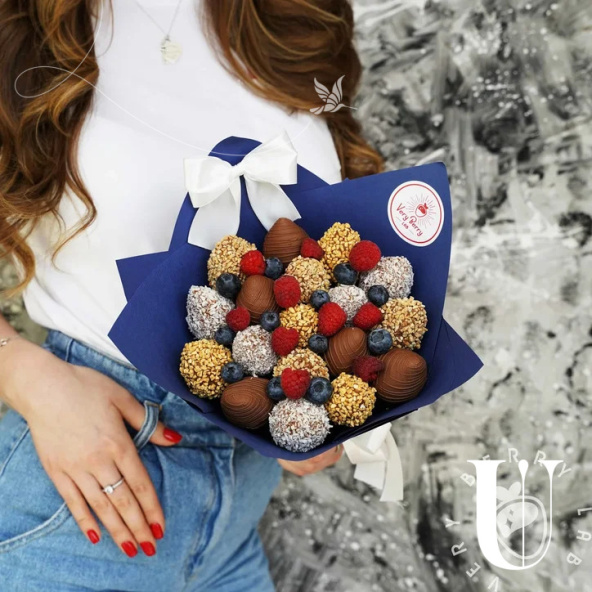 - В данном размере букета помещается до 23 ягод отборной и крупной клубники с добавлением малины и голубики. Средний вес букета - 600 г! Порадуйте своих близких шикарным сочетанием шоколада и свежей клубники