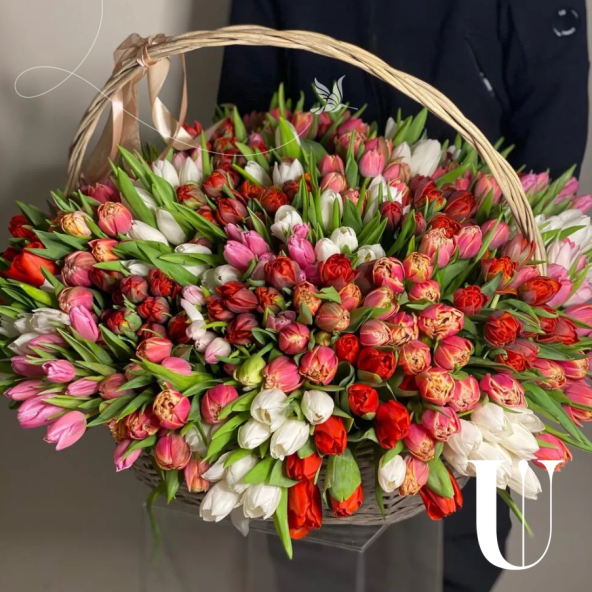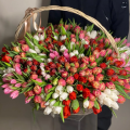 Композиция из кустовых пионовидных роз сортов Мисти Бабблз и Мисс Бомбастик в корзине