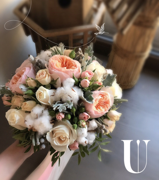 Пионовидная роза, кустовая роза, роза одноголовая, седум, бруния, фисташка