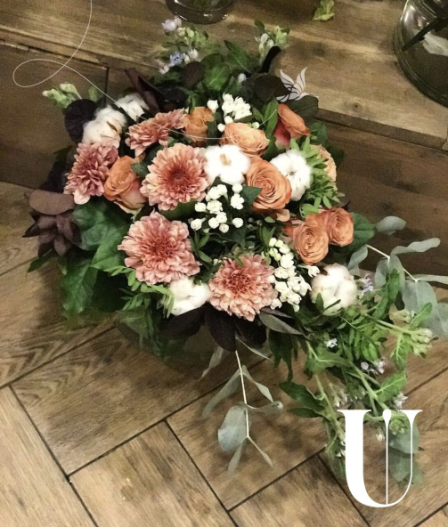 Авторский букет в нежно-золотистой гамме в розовый упаковке