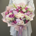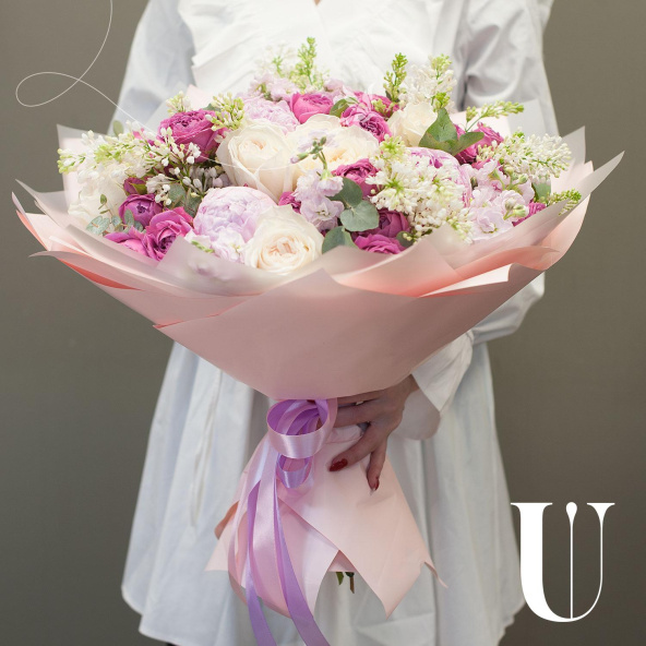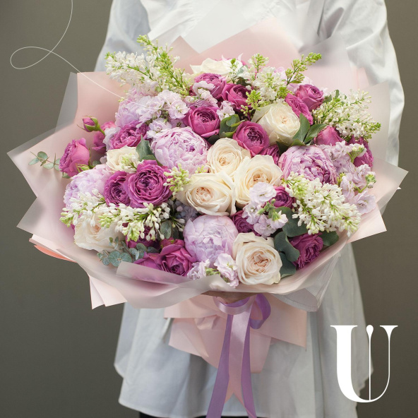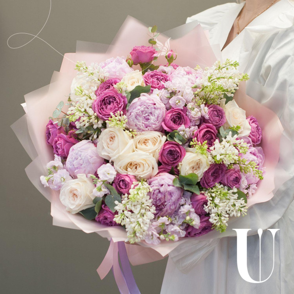 Букет цветов "Королевская аранжерея" - это уникальное сочетание пионовидных роз, пионов, сирени и других цветов и зелени. Этот сборный букет станет отличным подарком для любого случая, будь то деловая встреча, романтическое свидание или просто знак внимания для близкого человека.
