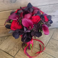 Букет из диантуса, альстромерий и белых орхидей в упаковке