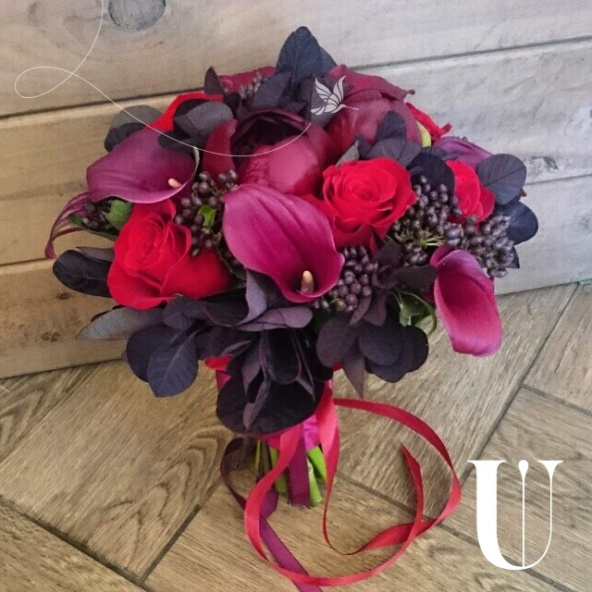 Композиция в оранжевых тонах из роз, диантусов и эустомы в корейской пленке