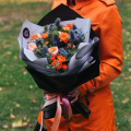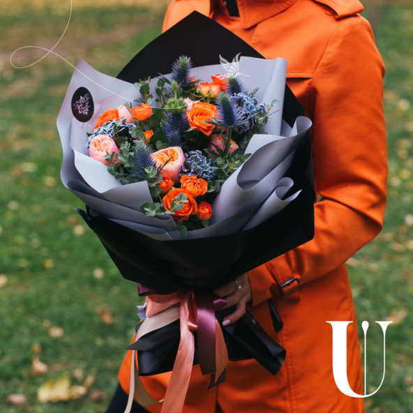 - Роза вувузела - 5 шт. роза кустовая - 4 шт. диантус - 3 шт. эрингиум - 2 шт. эвкалипт - 1 шт.Упаковка - 2 шт. лента - 2 шт