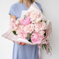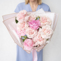 Авторский букет в нежных тонах из диантусов, маттиол, хризантем и кустовых роз в упаковке