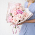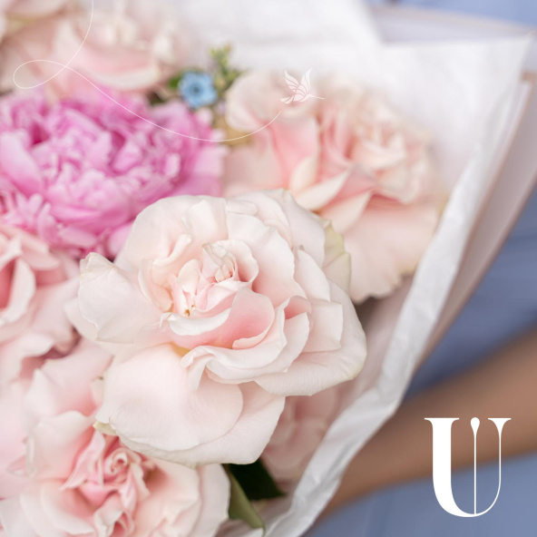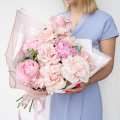 Авторский букет из белых и розовых альстромерий, розовых диантусов, светло-розовых роз 60 см в упаковке