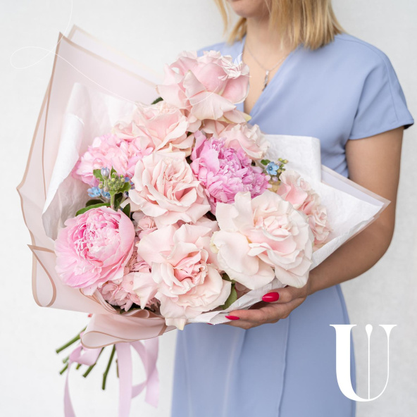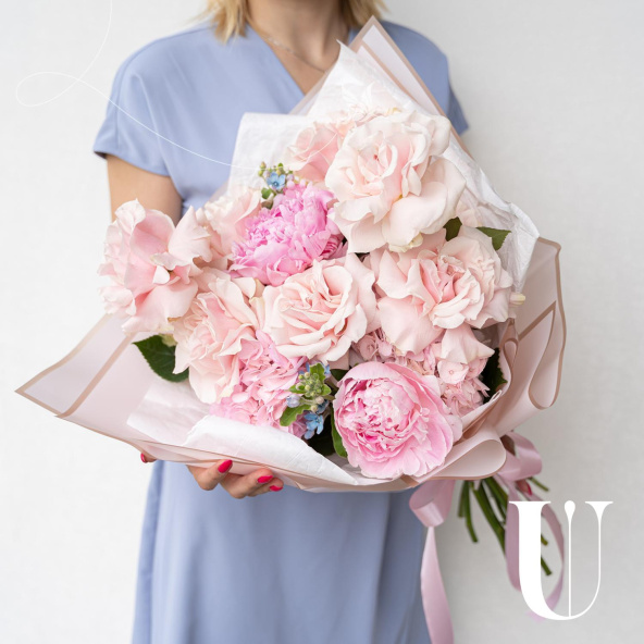 Авторский букет из роз Пинк Охара, роз Мемори Лейн, розовых эустом и лавандовых маттиол в дизайнерской упаковке