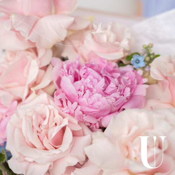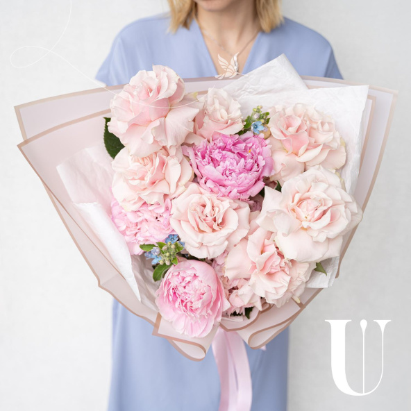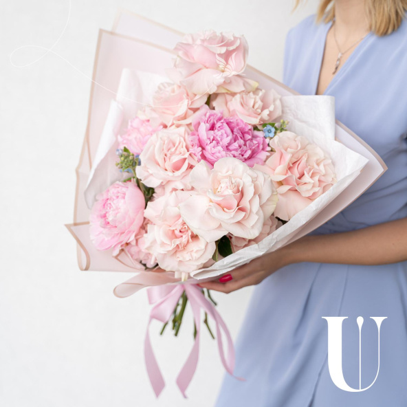 Авторский букет из розовых роз, розовых диантусов и белых эустом в розовой упаковке