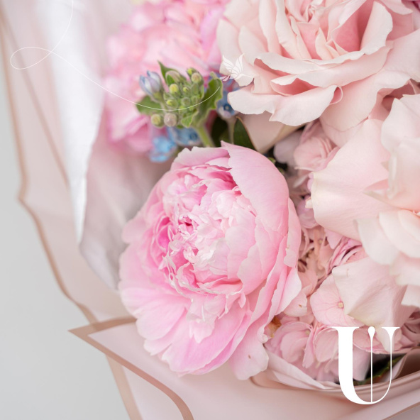 Авторский букет из белой гортензии, светло-розовых роз и кустовых роз Стерлинг в упаковке