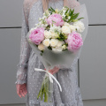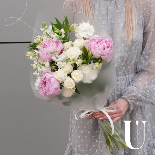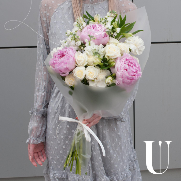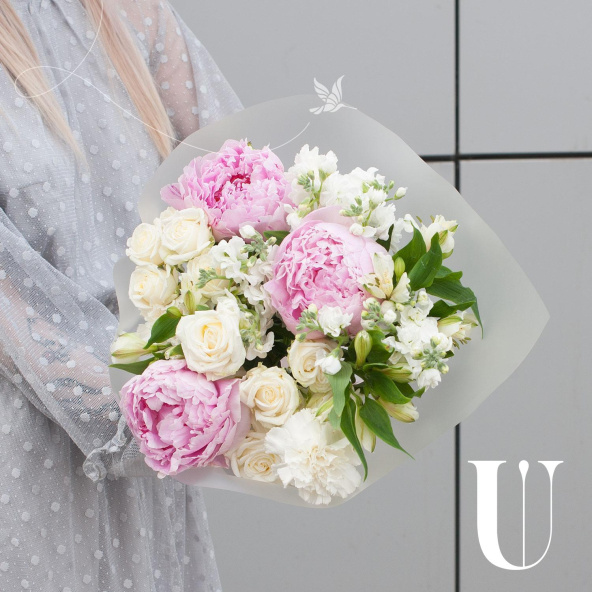 Букет выполнен в розовых и белых тонах, что делает его ярким и запоминающимся.