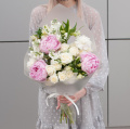 Букет цветов "Ти амо" - это сборный букет, состоящий из различных видов цветов, таких как пионы, розы, альстромерии, маттиолы и гвоздики.